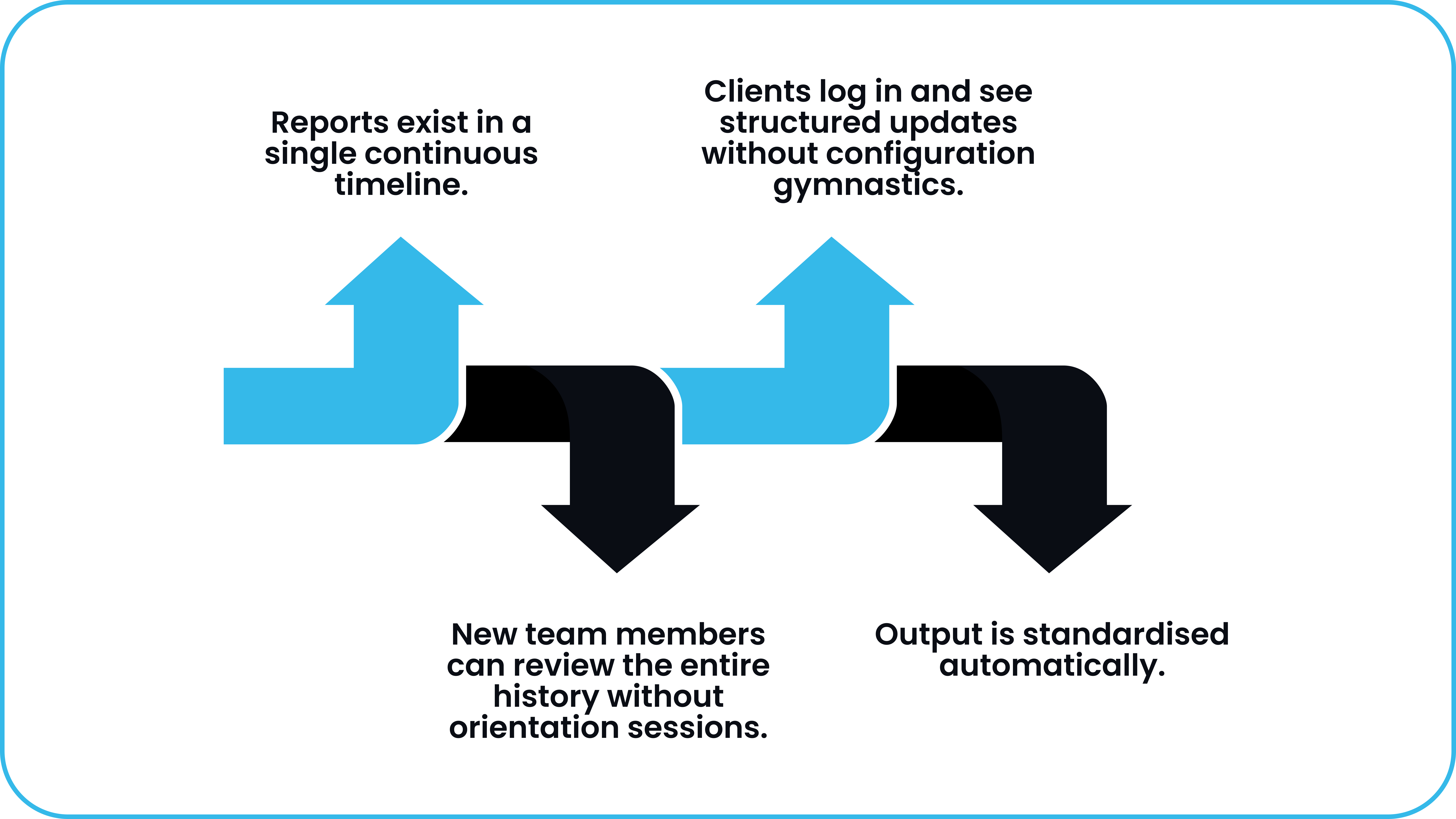 When a project is created in Wholistic today, every artefact is linked from the start. Reports exist in a single continuous timeline. New team members can review the entire history without orientation sessions. Clients log in and see structured updates without configuration gymnastics. Output is standardised automatically.
